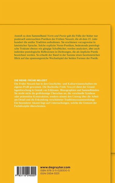 Der Band Norm und Poesie versammelt 17 Beiträge internationaler Fachgelehrter, die sich mit dem unterschiedlichen Verständnis von Dichtung sowie mit den Interdependenzen zwischen Dichtungstheorie und Dichtung in der Frühen Neuzeit befassen. Eine Reihe von poetologischen Traktaten, die mehrheitlich in lateinischer Sprache verfasst und der antiken Tradition verpflichtet sind, werden als Beispiele expliziter Regel-Poetik analysiert. Der Bezug der Poetik zur zeitgenössischen Poesie wird dabei ebenso in den Blick genommen wie das Verhältnis der Poetik zu den anderen Künsten, namentlich der Schwesterkunst der Rhetorik. Diese Beiträge werden ergänzt durch solche, in denen aufgezeigt wird, wie einzelne Dichtungen über ein Verweissystem intertextueller Bezüge u.a. Reflexionen über poetologische Maximen transprotieren und auf diese Weise eine implizite Poetik bieten. Die Kombination von Untersuchungen sowohl zur expliziten oder normativen Poetik als auch zur impliziten oder selbstreflexiv inhärenten Poetik erlaubt einen facettenreichen Blick auf das spannungsvolle Wechselspiel der beiden sich gegenseitig beeinflussenden Formen der Poetik.