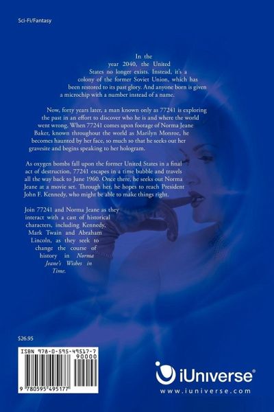 In the year 2040, the United States no longer exists. Instead, it's a province of the former Soviet Union, which has been restored to its past glory. And each newborn child is assigned a Designation Number instead of a name. Now, forty years later, a man known only as 77241 escapes into the past in an effort to discover where the world went wrong. When 77241 comes upon footage of Norma Jeane Baker, known throughout the world as Marilyn Monroe, he becomes haunted by her face, so much so that he seeks out her gravesite and begins speaking to her hologram. As oxygen bombs fall upon the former United States in a final act of destruction, 77241 escapes in a time bubble traveling back to June 1960. Once there, he seeks out Norma Jeane at a movie set. Through her, he attempts to save John F. Kennedy from his all-too-early demise hoping to alter enough of the past to change the world's future destruction. Join 77241 and Norma Jeane as they interact with a cast of historical characters, including Kennedy, Mark Twain and Abraham Lincoln, as they seek to change the course of history in Norma Jeane's Wishes in Time.