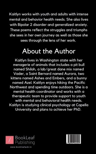 Kaitlyn lives in Washington state with her menagerie of animals that includes a pit bull named Shiloh, a lab/great dane mix named Vader, a Saint Bernard named Aurora, two kittens named Ashes and Embers, and a bunny named Azel. Kaitlyn enjoys hiking the Pacific Northwest and spending time outdoors. She is a mental health coordinator and works with a therapeutic team to provide support to youth with mental and behavioral health needs. Kaitlyn is studying clinical psychology at Capella University and plans to achieve her PhD.