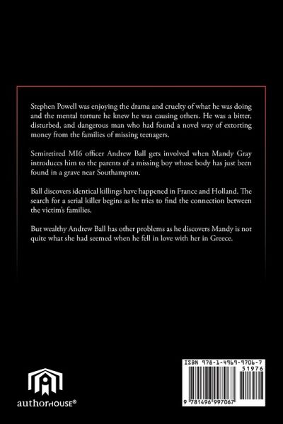 Stephen Powell was enjoying the drama and cruelty of what he was doing and the mental torture he knew he was causing others. He was a bitter, disturbed, and dangerous man who had found a novel way of extorting money from the families of missing teenagers. Semiretired MI6 officer Andrew Ball gets involved when Mandy Gray introduces him to the parents of a missing boy whose body has just been found in a grave near Southampton. Ball discovers identical killings have happened in France and Holland. The search for a serial killer begins as he tries to find the connection between the victim's families. But wealthy Andrew Ball has other problems as he discovers Mandy is not quite what she had seemed when he fell in love with her in Greece.