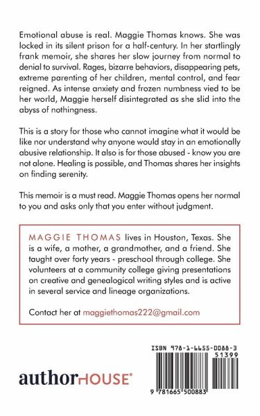 Emotional abuse is real. Maggie Thomas knows. She was locked in its silent prison for a half-century. In her startlingly frank memoir, she shares her slow journey from normal to denial to survival. Rages, bizarre behaviors, disappearing pets, extreme parenting of her children, mental control, and fear reigned. As intense anxiety and frozen numbness vied to be her world, Maggie herself disintegrated as she slid into the abyss of nothingness. This is a story for those who cannot imagine what it would be like nor understand why anyone would stay in an emotionally abusive relationship. It also is for those abused - know you are not alone. Healing is possible, and Thomas shares her insights on finding serenity. This memoir is a must read. Maggie Thomas opens her normal to you and asks only that you enter without judgment.