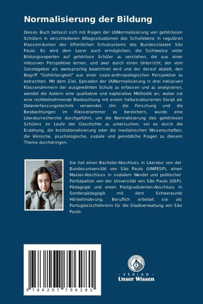 Dieses Buch befasst sich mit Fragen der (A)Normalisierung von gehörlosen Schülern in verschiedenen Alltagssituationen des Schullebens in regulären Klassenräumen des öffentlichen Schulsystems des Bundesstaates São Paulo. Es wird dem Leser auch ermöglichen, die Sichtweise vieler Bildungsexperten auf gehörlose Schüler zu verstehen, die aus einer inklusiven Perspektive lernen, und zwar durch einen Unterricht, der vom Gesetzgeber als zweisprachig bezeichnet wird und der darauf abzielt, den Begriff "Gehörlosigkeit" aus einer sozio-anthropologischen Perspektive zu betrachten. Mit dem Ziel, Episoden der (A)Normalisierung in drei inklusiven Klassenzimmern der ausgewählten Schule zu erfassen und zu analysieren, wendet die Autorin eine qualitative und explorative Methodik an, wobei sie eine nichtteilnehmende Beobachtung mit einem halbstrukturierten Skript als Datenerfassungstechnik verwendet. Um die Forschung und die Beobachtungen im Klassenzimmer zu bereichern, wurde eine Literaturrecherche durchgeführt, um die Normalisierung des gehörlosen Schülers im Laufe der Geschichte zu untersuchen, sei es durch die Erziehung, die Institutionalisierung oder die medizinischen Wissenschaften, die klinische, psychologische, soziale und gesetzliche Fragen zu diesem Thema durchdringen.