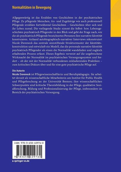 Allgegenwärtig ist das Erzählen von Geschichten in der psychiatrischen Pflege. Zu pflegende Menschen, An- und Zugehörige wie auch professionell Pflegende erzählen fortwährend Geschichten - Geschichten über sich und ihr Leben zumal. Die vorliegende Studie nimmt die Selbst- bzw. Lebensgeschichten psychiatrisch Pflegender in den Blick und geht der Frage nach, wie die als psychiatrisch Pflegende bezeichneten Personen ihre narrative Identität konstruieren. Anhand autobiographisch-narrativer Interviews rekonstruiert Nicole Duveneck das zentrale sinnstiftende Strukturmuster der Identitätskonstruktion und entwickelt ein Modell, das die personale narrative Identität psychiatrisch Pflegender als einen die Normalität wandelnden und zugleich erhaltenden Prozess erfasst. Dieses Ergebnis verweist auf die ungebrochene Wirkmacht der Normalität im psychiatrischen Versorgungssystem und fordert - ob der mit der Normalität verbundenen exkludierenden Praktiken - zum kritischen Diskurs über und füreine gute psychiatrische Pflege auf.