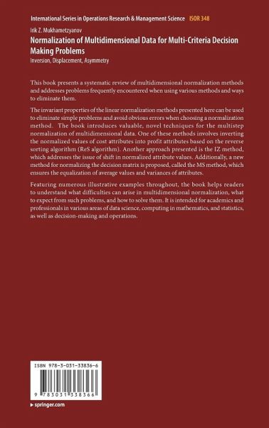 The invariant properties of the linear normalization methods presented here can be used to eliminate simple problems and avoid obvious errors when choosing a normalization method. The book introduces valuable, novel techniques for the multistep normalization of multidimensional data. One of these methods involves inverting the normalized values of cost attributes into profit attributes based on the reverse sorting algorithm (ReS algorithm). Another approach presented is the IZ method, which addresses the issue of shift in normalized attribute values. Additionally, a new method for normalizing the decision matrix is proposed, called the MS method, which ensures the equalization of average values and variances of attributes.