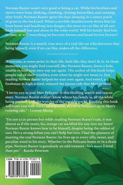 Norman Baxter wasn't very good at being a cat. While his brothers and sisters were busy slinking, climbing, chasing butterflies and running after birds, Norman Baxter spent his days sleeping in a sunny patch of grass in the backyard. When a terrible thunderstorm drives him far from home and headlong into danger, this most un-cat-like of all cats finds himself lost and alone in the wide world. Will his family find him in time, or will everything he has ever known and loved be lost forever? ¿Norman Baxter is a mostly true story of a real-life cat who discovers that being himself, even if un-cat-like, makes all the difference.