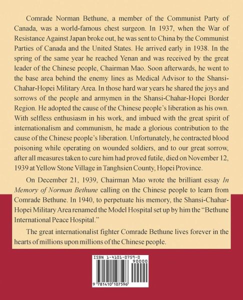Comrade Norman Bethune, a member of the Communist Party of Canada, was a world-famous chest surgeon. In 1937, when the War of Resistance Against Japan broke out, he was sent to China by the Communist Parties of Canada and the United States. He arrived early in 1938. In the spring of the same year he reached Yenan and was received by the great leader of the Chinese people, Chairman Mao. Soon afterwards, he went to the base area behind the enemy lines as Medical Advisor to the Shansi-Chahar-Hopei Military Area. In those hard war years he shared the joys and sorrows of the people and armymen in the Shansi-Chahar-Hopei Border Region. He adopted the cause of the Chinese people's liberation as his own. With selfless enthusiasm in his work, and imbued with the great spirit of internationalism and communism, he made a glorious contribution to the cause of the Chinese people's liberation. Unfortunately, he contracted blood poisoning while operating on wounded soldiers, and to our great sorrow, after all measures taken to cure him had proved futile, died on November 12, 1939 at Yellow Stone Village in Tanghsien County, Hopei Province. On December 21, 1939, Chairman Mao wrote the brilliant essay In Memory of Norman Bethune calling on the Chinese people to learn from Comrade Bethune. In 1940, to perpetuate his memory, the Shansi-Chahar-Hopei Military Area renamed the Model Hospital set up by him the "Bethune International Peace Hospital." The great internationalist fighter Comrade Bethune lives forever in the hearts of millions upon millions of the Chinese people.