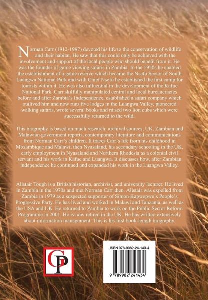 Norman Carr (1912-1997) devoted his life to the conservation of wildlife and their habitat. He saw that this could only be achieved with the involvement and support of the local people who should benefit from it. He was the founder of game viewing safaris in Zambia. In the 1950s he enabled the establishment of a game reserve which became the Nsefu Sector of South Luangwa National Park and with Chief Nsefu he established the first camp for tourists within it. He was also influential in the development of the Kafue National Park. Carr skilfully manipulated central and local bureaucracies before and after Zambia's Independence, established a safari company which outlived him and now runs five lodges in the Luangwa Valley, pioneered walking safaris, wrote several books and raised two lion cubs which were successfully returned to the wild.