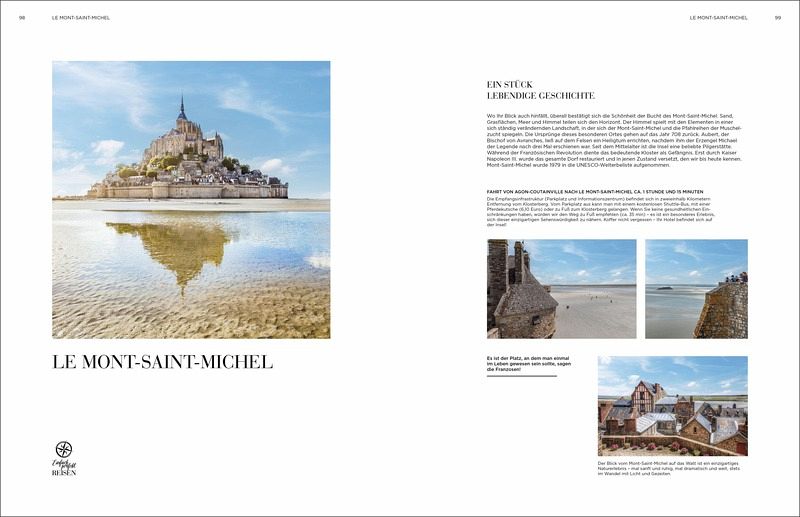 Die Normandie besitzt eine Sehenswürdigkeit, die Aufnahme in die UNESCO-Welterbeliste fand: In einer großen Bucht erhebt sich der Klosterberg Mont-Saint-Michel. Es erwarten Sie aber auch viele charmante Dörfer mit regionalspezifischem Charakter, die zu den schönsten Frankreichs gehören, märchenhafte Schlösser und farbenfrohe, idyllische Landschaften. Die Städte der Normandie bestechen durch ihre angenehme Größe und sichtbare Authentizität, die schon den bedeutendsten Impressionisten Claude Monet inspiriert haben. Die Geschichte der Normandie ist allgegenwärtig: von ihrer Gründung durch die Wikinger über Wilhelm den Eroberer 1066 bis hin zum D-Day 1944 mit der Landung der Alliierten. Die Plätze, die Restaurants, die Hotels, die wir für Sie ausgewählt haben, verbindet eines - sie haben alle einen besonderes Flair, damit Sie "Einfach perfekt reisen". Eine kleine Auflistung, was Sie erwartet: - Giverny: im Garten von Claude Monet - Rouen: Stadt der 100 Kirchtürme - Ètretat: schneeweiße Steilküste - Honfleuer: malerisches Hafenstädtchen - Deauville: Treffpunkt der Eleganz - D-Day: die Landungsstrände der Normandie - Le Mont-Saint-Michel: Weltkulturerbe und vieles mehr
