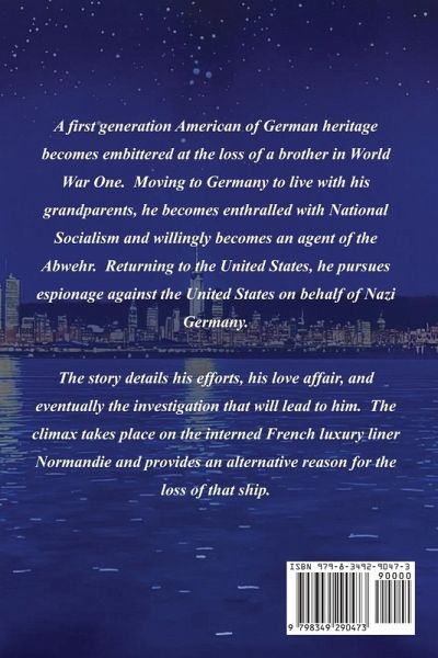 A first generation American of German heritage becomes embittered at the loss of a brother in World War One. Moving to Germany to live with his grandparents, he becomes enthralled with National Socialism and willingly becomes an agent of the Abwehr. Returning to the United States, he pursues espionage against the United States on behalf of Nazi Germany. The story details his efforts, his love affair, and eventually the investigation that will lead to him. The climax takes place on the interned French luxury liner Normandie and provides an alternative reason for the loss of that ship.