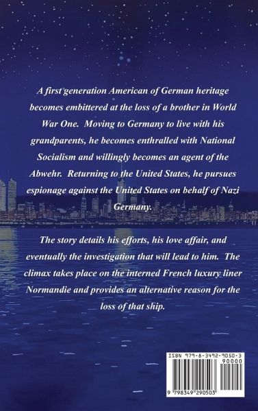 A first generation American of German heritage becomes embittered at the loss of a brother in World War One. Moving to Germany to live with his grandparents, he becomes enthralled with National Socialism and willingly becomes an agent of the Abwehr. Returning to the United States, he pursues espionage against the United States on behalf of Nazi Germany. The story details his efforts, his love affair, and eventually the investigation that will lead to him. The climax takes place on the interned French luxury liner Normandie and provides an alternative reason for the loss of that ship.