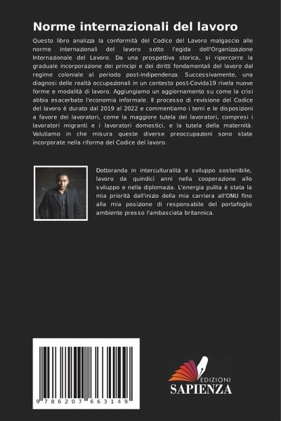 Questo libro analizza la conformità del Codice del Lavoro malgascio alle norme internazionali del lavoro sotto l'egida dell'Organizzazione Internazionale del Lavoro. Da una prospettiva storica, si ripercorre la graduale incorporazione dei principi e dei diritti fondamentali del lavoro dal regime coloniale al periodo post-indipendenza. Successivamente, una diagnosi delle realtà occupazionali in un contesto post-Covida19 rivela nuove forme e modalità di lavoro. Aggiungiamo un aggiornamento su come la crisi abbia esacerbato l'economia informale. Il processo di revisione del Codice del lavoro è durato dal 2019 al 2022 e commentiamo i temi e le disposizioni a favore dei lavoratori, come la maggiore tutela dei lavoratori, compresi i lavoratori migranti e i lavoratori domestici, e la tutela della maternità. Valutiamo in che misura queste diverse preoccupazioni sono state incorporate nella riforma del Codice del lavoro.