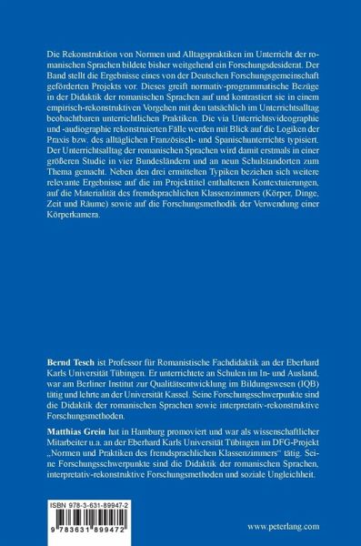 Die Rekonstruktion von Normen und Alltagspraktiken im Unterricht der romanischen Sprachen bildete bisher weitgehend ein Forschungsdesiderat. Der Band stellt die Ergebnisse eines von der Deutschen Forschungsgemeinschaft geförderten Projekts vor. Dieses greift normativ-programmatische Bezüge in der Didaktik der romanischen Sprachen auf und kontrastiert sie in einem empirisch-rekonstruktiven Vorgehen mit den tatsächlich im Unterrichtsalltag beobachtbaren unterrichtlichen Praktiken. Die via Unterrichtsvideographie und -audiographie rekonstruierten Fälle werden mit Blick auf die Logiken der Praxis bzw. des alltäglichen Französisch- und Spanischunterrichts typisiert. Der Unterrichtsalltag der romanischen Sprachen wird damit erstmals in einer größeren Studie in vier Bundesländern und an neun Schulstandorten zum Thema gemacht. Neben den drei ermittelten Typiken beziehen sich weitere relevante Ergebnisse auf die im Projekttitel enthaltenen Kontextuierungen, auf die Materialität des fremdsprachlichen Klassenzimmers (Körper, Dinge, Zeit und Räume) sowie auf die Forschungsmethodik der Verwendung einer Körperkamera.
