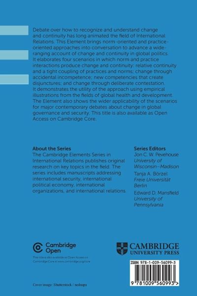 This Element discusses norm- and practice-oriented approaches for advancing a wide-ranging account of change and continuity in global politics. It elaborates four scenarios in which norm and practice interactions produce change and continuity. This title is also available as Open Access on Cambridge Core.