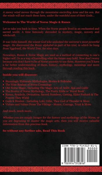 A snowy wind moves through the mountains encircling Arne and his son. But the winds will not reach them here, under the watchful eyes of their Gods... Welcome to The World of Norse Magic & Runes Let us take you back in time. When the Norse people lived in an enchanted and sacred world. A time famously shrouded in mystery, magic, sorcery and witchcraft. It was Odin himself, the wisest God who unlocked the universe's most powerful magic. He discovered the Runic alphabet as part of his trial, in which he hung from Yggdrasil, the World Tree, for nine days. Nowadays, Runes & Norse Magic are used as a method of connecting to one's higher self. Or as a way of foretelling what the future may hold. Now don't worry because you don't have to be of Norse ancestry to use them. However you'll have a far better understanding of them, history, mythology, meanings and more through reading this book. Inside you will discover: Stunningly Elaborate Mythologies, Stories & Folktales The Nine Realms of Norse Cosmology Old Norse Magic, Including The Magic Arts of: Seiðr, Spá and Galdr The Source of Norse Mythology, The Poetic Edda or 'Royal Book'. Runes, Symbols, Divination, Sacred Numbers, Casting, Elder Futhark & The Powers They Wield Gods & Realms - Including Loki, Odin, Thor God of Thunder & More Virtues and Values From The Vikings - Honor, Courage, Trust & More And much, much more... Whether you are simply hungry for the history and mythology of the Norse, or you are beginning to master the magic arts, then you will receive valuable information from this precious book. So without any further ado, Read This Book