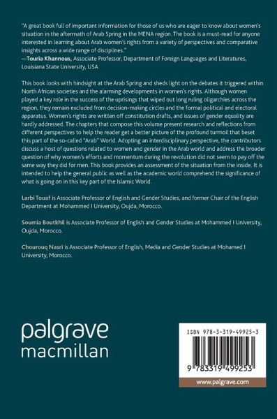 This book looks with hindsight at the Arab Spring and sheds light on the debates it triggered within North African societies and the alarming developments in women's rights. Although women played a key role in the success of the uprisings that wiped out long ruling oligarchies across the region, they remain excluded from decision-making circles and the formal political and electoral apparatus. Women's rights are written off constitution drafts, and issues of gender equality are hardly addressed. The chapters that compose this volume present research and reflections from different perspectives to help the reader get a better picture of the profound turmoil that beset this part of the so-called "Arab" World. Adopting an interdisciplinary perspective, the contributors discuss a host of questions related to women and gender in the Arab world and address the broader question of why women's efforts and momentum during the revolution did not seem to pay off the same way they did for men. Thisbook provides an assessment of the situation from the inside. It is intended to help the general public as well as the academic world comprehend the significance of what is going on in this key part of the Islamic World.