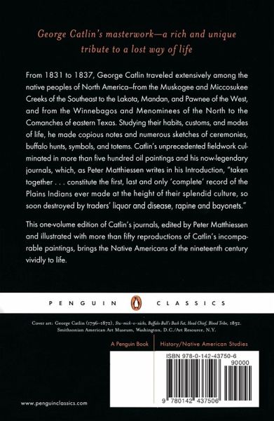 From 1831 to 1837, George Catlin traveled extensively among the native peoples of North America-from the Muskogee and Miccosukee Creeks of the Southeast to the Lakota, Mandan, and Pawnee of the West, and from the Winnebagos and Menominees of the North to the Comanches of eastern Texas. Studying their habits, customs, and modes of life, he made copious notes and numerous sketches of ceremonies, buffalo hunts, symbols, and totems. Catlin's unprecedented fieldwork culminated in more than five hundred oil paintings and his now-legendary journals, which, as Peter Matthiessen writes in his introduction, "taken together... constitute the first, last, and only 'complete' record of the Plains Indians ever made at the height of their splendid culture, so soon destroyed by traders' liquor and disease, rapine and bayonets." * A one-volume edition of Catlin's journals * Illustrated with more than fifty reproductions of Catlin's incomparable paintings