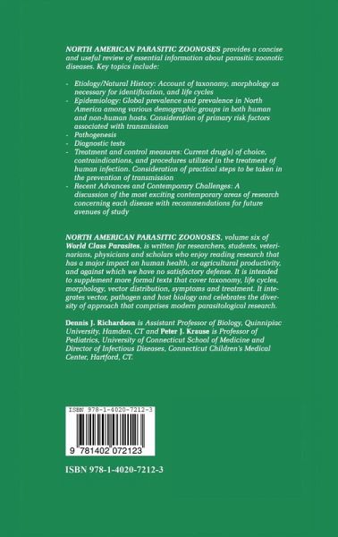 North American Parasitic Zoonoses, volume six of "World Class Parasites", is written for researchers, students, veterinarians, physicians and scholars who enjoy reading research that has a major impact on human health, or agricultural productivity, and against which we have no satisfactory defense. It is intended to supplement more formal texts that cover taxonomy, life cycles, morphology, vector distribution, symptoms and treatment. It integrates vector, pathogen and host biology and celebrates the diversity of approach that comprises modern parasitological research.