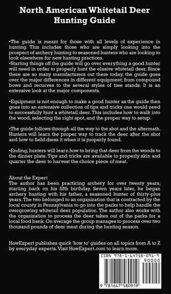 • The guide is meant for those with all levels of experience in hunting. This includes those who are simply looking into the prospect of archery hunting to seasoned hunters who are looking to look elsewhere for new hunting practices. • Starting things off the guide will go over everything a good hunter will need in order to properly hunt the elusive whitetail deer. Since there are so many manufacturers out there today, the guide goes over the major differences in different equipment; from compound bows and recurves to the several styles of tree stands. It is an extensive look at the major components. • Equipment is not enough to make a good hunter as the guide then goes into an extensive collection of tips and tricks one would need to successfully hunt a whitetail deer. This includes how to walk into the wood, selecting the right spot, and the proper way to setup. • The guide follows through all the way to the shot and the aftermath. Hunters will learn the proper way to track the deer after the shot and how to field dress it when it is properly found. • Ending, hunters will learn how to bring that deer from the woods to the dinner plate. Tips and tricks are available to properly skin and quarter the deer to harvest the choice piece of meat. About the Expert The author has been practicing archery for over twenty years, starting back on his fifth birthday. Seven years later, he began archery hunting with his father, a seasoned hunter of thirty-plus years. The two belonged to an organization that is contracted by the local county in Pennsylvania to go into the parks to help handle the overgrowing whitetail deer population. The author also works with the organization to process the deer taken out of the parks for a local food bank. On average the group manages to process over two thousand pounds of deer meat during the hunting season. HowExpert publishes quick 'how to' guides on all topics from A to Z by everyday experts.