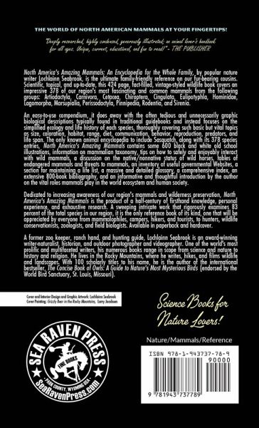 North America's Amazing Mammals: An Encyclopedia for the Whole Family, by popular nature writer Lochlainn Seabrook, is the ultimate family-friendly reference on our fur-bearing cousins. Scientific, topical, and up-to-date, this 424 page, fact-filled, vintage-styled wildlife book covers an impressive 378 of our region's most fascinating and common mammals from the following groups: Artiodactyla, Carnivora, Cetacea, Chiroptera, Cingulata, Eulipotyphla, Hominidae, Lagomorpha, Marsupialia, Perissodactyla, Pinnipedia, Rodentia, and Sirenia. An easy-to-use compendium, it does away with the often tedious and unnecessarily graphic biological descriptions typically found in traditional guidebooks and instead focuses on the simplified ecology and life history of each species, thoroughly covering such basic but vital topics as size, coloration, habitat, range, diet, communication, behavior, reproduction, predators, and life span. The only known animal encyclopedia to include Sasquatch, along with its 378 species entries, North America's Amazing Mammals contains some 600 black and white old school illustrations, information on mammalian taxonomy, tips on how to safely and enjoyably interact with wild mammals, a discussion on the native/nonnative status of wild horses, tables of endangered mammals and threats to mammals, an inventory of useful governmental Websites, a section for maintaining a life list, a massive and detailed glossary, a comprehensive index, an extensive 800-book bibliography, and an informative and thoughtful introduction by the author on the vital roles mammals play in the world ecosystem and human society. Dedicated to increasing awareness of our region's mammals and wilderness preservation, North America's Amazing Mammals is the product of a half-century of firsthand knowledge, personal experience, and exhaustive research. A sweeping intricate work that rigorously examines 83 percent of the total species in our region, it is the only reference book of its kind, one that will be appreciated by everyone from mammalophiles, campers, hikers, and tourists, to hunters, wildlife conservationists, zoologists, and field biologists. Available in paperback and hardcover. A former zoo keeper, ranch hand, and hunting guide, Lochlainn Seabrook is an award-winning writer-naturalist, historian, and outdoor photographer. One of the world's most prolific and multifaceted writers, his numerous books range in scope from science and nature to history and religion. He is the author of the international bestseller, The Concise Book of Owls: A Guide to Nature's Most Mysterious Birds (endorsed by the World Bird Sanctuary, St. Louis, MO), as well as The Concise Book of Tigers: A Guide to Nature's Most Remarkable Cats; Rocky Mountain Equines: A Photographic Collection of Horses, Donkeys, and Mules of the American West; and Rocky Mountain Bison: A Photographic Collection of Bison of the American West.