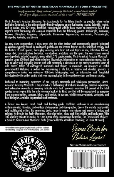 North America's Amazing Mammals: An Encyclopedia for the Whole Family, by popular nature writer Lochlainn Seabrook, is the ultimate family-friendly reference on our fur-bearing cousins. Scientific, topical, and up-to-date, this 424 page, fact-filled, vintage-styled wildlife book covers an impressive 378 of our region's most fascinating and common mammals from the following groups: Artiodactyla, Carnivora, Cetacea, Chiroptera, Cingulata, Eulipotyphla, Hominidae, Lagomorpha, Marsupialia, Perissodactyla, Pinnipedia, Rodentia, and Sirenia. An easy-to-use compendium, it does away with the often tedious and unnecessarily graphic biological descriptions typically found in traditional guidebooks and instead focuses on the simplified ecology and life history of each species, thoroughly covering such basic but vital topics as size, coloration, habitat, range, diet, communication, behavior, reproduction, predators, and life span. The only known animal encyclopedia to include Sasquatch, along with its 378 species entries, North America's Amazing Mammals contains some 600 black and white old school illustrations, information on mammalian taxonomy, tips on how to safely and enjoyably interact with wild mammals, a discussion on the native/nonnative status of wild horses, tables of endangered mammals and threats to mammals, an inventory of useful governmental Websites, a section for maintaining a life list, a massive and detailed glossary, a comprehensive index, an extensive 800-book bibliography, and an informative and thoughtful introduction by the author on the vital roles mammals play in the world ecosystem and human society. Dedicated to increasing awareness of our region's mammals and wilderness preservation, North America's Amazing Mammals is the product of a half-century of firsthand knowledge, personal experience, and exhaustive research. A sweeping intricate work that rigorously examines 83 percent of the total species in our region, it is the only reference book of its kind, one that will be appreciated by everyone from mammalophiles, campers, hikers, and tourists, to hunters, wildlife conservationists, zoologists, and field biologists. Available in paperback and hardcover. A former zoo keeper, ranch hand, and hunting guide, Lochlainn Seabrook is an award-winning writer-naturalist, historian, and outdoor photographer. One of the world's most prolific and multifaceted writers, his numerous books range in scope from science and nature to history and religion. He is the author of the international bestseller, The Concise Book of Owls: A Guide to Nature's Most Mysterious Birds (endorsed by the World Bird Sanctuary, St. Louis, MO), as well as The Concise Book of Tigers: A Guide to Nature's Most Remarkable Cats; Rocky Mountain Equines: A Photographic Collection of Horses, Donkeys, and Mules of the American West; and Rocky Mountain Bison: A Photographic Collection of Bison of the American West.