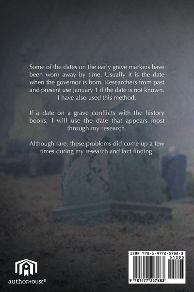 Some of the dates on the early grave markers have been worn away by time. Usually it is the date when the governor is born. Researchers from past and present use January 1 if the date is not known. I have also used this method. If a date on a grave conflicts with the history books, I will use the date that appears most through my research. Although rare, these problems did come up a few times during my research and fact finding.