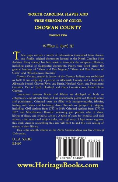 These pages contain a wealth of information transcribed from obscure and fragile, original documents housed at the North Carolina State Archives. Every attempt has been made to transcribe the complete collection, including partial or fragmented documents. Papers were listed under the general headings of "Slaves and Free Negroes," "Slaves and Free Persons of Color" and "Miscellaneous Records." Chowan County, named in honor the Chowan Indians, was established in 1670. It was originally a precinct in Albemarle County, and is bound by Albemarle Sound, Chowan River, and Bertie, Hertford, Gates, and Perquimans counties. Part of Tyrell, Hertford and Gates counties were formed from Chowan. Interactions between Blacks and Whites are displayed on both an antagonistic and intimate level, and are dramatically played out through crime and punishment. Criminal cases are filled with intrigue-murder, felonies, trading with slaves and harboring slaves. Records are grouped by category, including: Civil Actions from 1757 to 1819; Criminal Actions from 1777 to 1817; and Miscellaneous Records containing gun permits, sales of slaves, hiring of slaves, and criminal actions. A table of cases for criminal and civil actions, a full name and subject index, and a glossary of legal terms augment this work. Anyone researching this area will want to add this rich catalog of names to their library. This is the seventh volume in the North Carolina And Free Persons Of Color series.