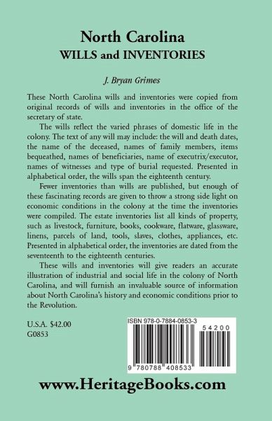 These North Carolina wills and inventories were copied from original records of wills and inventories in the office of the secretary of state. The wills reflect the varied phrases of domestic life in the colony. The text of any will may include: the will and death dates, the name of the deceased, names of family members, items bequeathed, names of beneficiaries, name of executrix/executor, names of witnesses and type of burial requested. Presented in alphabetical order, the wills span the eighteenth century. Fewer inventories than wills are published, but enough of these fascinating records are given to throw a strong side light on economic conditions in the colony at the time the inventories were compiled. The estate inventories list all kinds of property, such as livestock, furniture, books, cookware, flatware, glassware, linens, parcels of land, tools, slaves, clothes, appliances, etc. Presented in alphabetical order, the inventories are dated from the seventeenth to the eighteenth centuries. These wills and inventories will give readers an accurate illustration of industrial and social life in the colony of North Carolina, and will furnish an invaluable source of information about North Carolina's history an economic conditions prior to the Revolution.