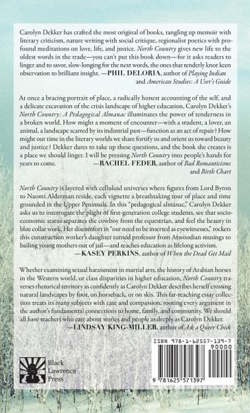 North Country: A Pedagogical Almanac is a memoir-in-essays about teaching and family life in Michigan's Upper Peninsula. The book follows the cycle of seasons in this remote and beautiful place by the waters of Lake Superior during the years in which the author finds a place there. It's also a look at higher education on the razor's edge at a tiny and struggling liberal arts college. Above all, the memoir is about a life lived alongside books and what they might teach us about how to love, parent, mentor, and care for others. "Carolyn Dekker has crafted the most original of books, tangling up memoir with literary criticism, nature writing with social critique, regionalist poetics with profound meditations on love, life, and justice. North Country gives new life to the oldest words in the trade--you can't put this book down--for it asks readers to linger and to savor, slow-longing for the next words, the ones that tenderly knot keen observation to brilliant insight."--Phil Deloria, author of Playing Indian and American Studies: A User's Guide "At once a bracing portrait of place, a radically honest accounting of the self, and a delicate excavation of the crisis landscape of higher education, Carolyn Dekker's North Country: A Pedagogical Almanac illuminates the power of tenderness in a broken world. How might a moment of encounter--with a student, a lover, an animal, a landscape scarred by its industrial past--function as an act of repair? How might our time in the literary worlds we share fortify us and orient us toward beauty and justice? Dekker dares to take up these questions, and the book she creates is a place we should linger. I will be pressing North Country into people's hands for years to come."--Rachel Feder, author of Bad Romanticisms and Birth Chart "North Country is layered with celluloid universes where figures from Lord Byron to Naomi Alderman reside, each vignette a breathtaking tour of place and time grounded in the Upper Peninsula. In this "pedagogical almanac," Carolyn Dekker asks us to interrogate the plight of first-generation college students, see that socioeconomic status separates the cowboy from the equestrian, and feel the beauty in blue collar work. Her discomfort in "our need to be inserted as eyewitnesses," rockets this construction worker's daughter turned professor from Atwoodian musings to bailing young mothers out of jail--and teaches education as lifelong activism."--Kasey Perkins, author of When the Dead Get Mail "Whether examining sexual harassment in martial arts, the history of Arabian horses in the Western world, or class disparities in higher education, North Country traverses rhetorical territory as confidently as Carolyn Dekker describes herself crossing natural landscapes by foot, on horseback, or on skis. This far-reaching essay collection treats its many subjects with care and compassion, rooting every argument in the author's fundamental connections to home, family, and community. We should all have teachers who care about stories and people as deeply as Carolyn Dekker."--Lindsay King-Miller, author of Ask a Queer Chick Memoir. Literary Criticism. Nature. Family & Relationships. Women's Studies.