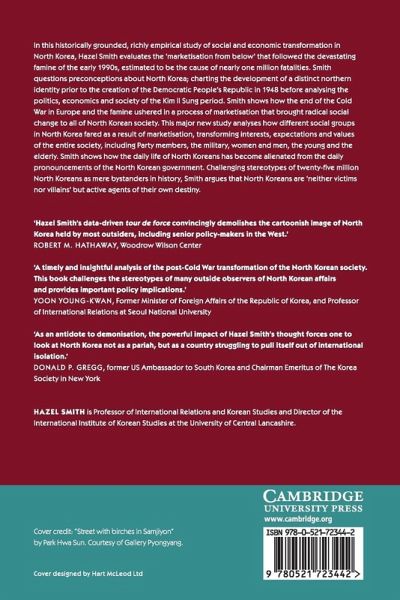 In this historically grounded, richly empirical study of social and economic transformation in North Korea, Hazel Smith evaluates the 'marketization from below' that followed the devastating famine of the early 1990s, estimated to be the cause of nearly one million fatalities. Smith shows how the end of the Cold War in Europe and the famine brought radical social change to all of North Korean society. This major new study analyses how marketization transformed the interests, expectations and values of the entire society, including Party members, the military, women and men, the young and the elderly. Smith shows how the daily life of North Koreans has become alienated from the daily pronouncements of the North Korean government. Challenging stereotypes of twenty-five million North Koreans as mere bystanders in history, Smith argues that North Koreans are 'neither victims nor villains' but active agents of their own destiny.