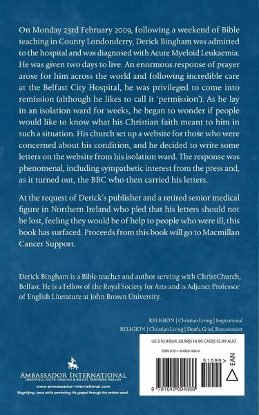 On Monday 23rd February 2009, following a weekend of Bible teaching in County Londonderry, Derick Bingham was admitted to the hospital and was diagnosed with Acute Myeloid Leukaemia. He was given two days to live. An enormous response of prayer arose for him across the world and following incredible care at the Belfast City Hospital, he was privileged to come into remission (although he likes to call it 'permission'). As he lay in an isolation ward for weeks, he began to wonder if people would like to know what his Christian faith meant to him in such a situation. His church set up a website for those who were concerned about his condition, and he decided to write some letters on the website from his isolation ward. The response was phenomenal, including sympathetic interest from the press and, as it turned out, the BBC who then carried his letters. At the request of Derick's publisher and a retired senior medical figure in Northern Ireland who pled that his letters should not be lost, feeling they would be of help to people who were ill, this book has surfaced. Proceeds from this book will go to Macmillan Cancer Support.