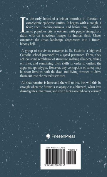 In the early hours of a winter morning in Toronto, a cataclysmic epidemic ignites. It begins with a cough, a fever, then unconsciousness, and before long, Canada's most populous city is overrun with people rising from death with an infectious hunger for human flesh. Chaos consumes the urban landscape degenerates into a frozen, bloody hell. A group of survivors converge in St. Casimir, a high-end Catholic school protected by a gated perimeter. There, they achieve some semblance of structure, making alliances, taking on roles, and combining their skills in order to outlast the apparent apocalypse. However, any conception of safety may be short-lived as both the dead and living threaten to drive them out into the merciless winter. All that remains is hope and the will to live, but will this be enough when the future is as opaque as a blizzard, when love disintegrates into terror, and death lurks around every corner?