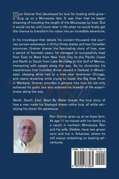RON GREINER first developed his love for boating while growing up on a Minnesota lake. It was then that he began dreaming of traveling the length of the Mississippi by boat. But it would not be until much later in life when he would finally get the chance to transform his vision into an incredible adventure. In his travelogue that details his sixteen-thousand mile journey across waterways in thirty-three states and two Canadian provinces, Greiner shares the fascinating story of how, over a period of fourteen years, he managed to successfully boat from East to West from New York City to the Pacific Coast and North to South from Lake Winnipeg to the Gulf of Mexico, interacting with people along the way. As he chronicles his experiences that included dinner aboard a towboat in Mississippi, sleeping while tied to a tree near downtown Chicago, and nearly drowning while trying to kayak the Big Hole River in Montana, Greiner provides a glimpse into how he not only achieved his goals, but also widened his breadth of life experiences along the way. North, South, East, West By Water shares the true story of how a man made his boyhood dream come true, all while satisfying his thirst for adventure.