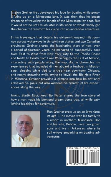 RON GREINER first developed his love for boating while growing up on a Minnesota lake. It was then that he began dreaming of traveling the length of the Mississippi by boat. But it would not be until much later in life when he would finally get the chance to transform his vision into an incredible adventure. In his travelogue that details his sixteen-thousand mile journey across waterways in thirty-three states and two Canadian provinces, Greiner shares the fascinating story of how, over a period of fourteen years, he managed to successfully boat from East to West from New York City to the Pacific Coast and North to South from Lake Winnipeg to the Gulf of Mexico, interacting with people along the way. As he chronicles his experiences that included dinner aboard a towboat in Mississippi, sleeping while tied to a tree near downtown Chicago, and nearly drowning while trying to kayak the Big Hole River in Montana, Greiner provides a glimpse into how he not only achieved his goals, but also widened his breadth of life experiences along the way. North, South, East, West By Water shares the true story of how a man made his boyhood dream come true, all while satisfying his thirst for adventure.