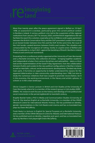 Emanating from a conference jointly organised at the University of Caen Normandy and La Rochelle University, this collectionof essays - bringing together academic and independent scholars from various disciplines and nationalities - takes a critical look at the implementation of the Good Friday Agreement, from the collaboration between Dublin and London to the new political configurations in Northern Ireland, as well as interfaith, cultural, social and economic developments. Divided into three main parts, it furnishes an opportunity to better understand the reasons for the apparent deterioration in inter-community understanding since 1998, but also to study the numerous initiatives that have sought to promote reconciliation, be it in the economy, the working environment, in the literary and artistic spheres, in schools or in the urban landscape.