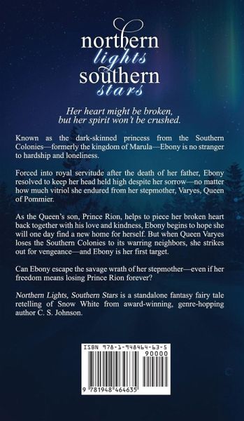 Her heart might be broken, but her spirit won't be crushed. Known as the dark-skinned princess from the Southern Colonies-formerly the kingdom of Marula-Ebony is no stranger to hardship and loneliness. Forced into royal servitude after the death of her father, Ebony resolved to keep her head held high despite her sorrow-no matter how much vitriol she endured from her stepmother, Varyes, Queen of Pommier. As the Queen's son, Prince Rion, helps to piece her broken heart back together with his love and kindness, Ebony begins to hope she will one day find a new home for herself. But when Queen Varyes loses the Southern Colonies to its warring neighbors, she strikes out for vengeance-and Ebony is her first target. Can Ebony escape the savage wrath of her stepmother-even if her freedom means losing Prince Rion forever? Northern Lights, Southern Skies is a standalone fantasy fairy tale retelling of Snow White from award-winning, genre-hopping author C. S. Johnson.