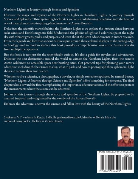 Northern Lights: A Journey through Science and Splendor Discover the magic and mystery of the Northern Lights in "Northern Lights: A Journey through Science and Splendor." This captivating book takes you on an enlightening expedition into the heart of one of nature's most awe-inspiring phenomena-the Aurora Borealis. Delve into the scientific marvels behind the Northern Lights as we explore the intricate dance between solar winds and Earth's magnetic field. Understand the physics of light and color that paint the night sky with vibrant greens, pinks, and purples, and learn about the latest advancements in aurora research. From the legends and lore that ancient cultures spun around these celestial displays to the cutting-edge technology used in modern studies, this book provides a comprehensive look at the Aurora Borealis from multiple perspectives. But this book is not just for the scientifically curious. It's also a guide for travelers and adventurers. Discover the best destinations around the world to witness the Northern Lights, from the remote Arctic wilderness to accessible spots near bustling cities. Get practical tips for planning your aurora adventure, including the best times to visit, what to pack, and how to photograph these ephemeral light shows to capture their true essence. Whether you're a scientist, a photographer, a traveler, or simply someone captivated by natural beauty, "Northern Lights: A Journey through Science and Splendor" offers something for everyone. The final chapters look toward the future, emphasizing the importance of conservation and the efforts to protect the environments where the aurora can be observed. Join us on this journey through the science and splendor of the Northern Lights. Be prepared to be amazed, inspired, and enlightened by the wonder of the Aurora Borealis. Embrace the adventure, uncover the science, and fall in love with the beauty of the Northern Lights.