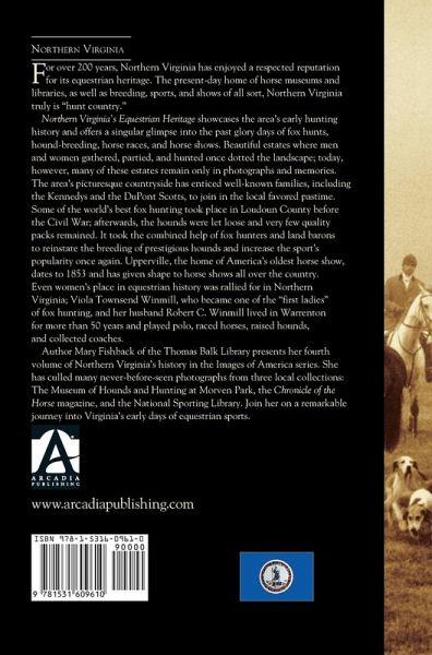 For over 200 years, Northern Virginia has enjoyed a respected reputation for its equestrian heritage. The present-day home of horse museums and libraries, as well as breeding, sports, and shows of all sort, Northern Virginia truly is "hunt country." Northern Virginia's Equestrian Heritage showcases the area's early hunting history and offers a singular glimpse into the past glory days of fox hunts, hound-breeding, horse races, and horse shows. Beautiful estates where men and women gathered, partied, and hunted once dotted the landscape; today, however, many of these estates remain only in photographs and memories. The area's picturesque countryside has enticed well-known families, including the Kennedys and the DuPont Scotts, to join in the local favored pastime. Some of the world's best fox hunting took place in Loudoun County before the Civil War; afterwards, the hounds were let loose and very few quality packs remained. It took the combined help of fox hunters and land barons to reinstate the breeding of prestigious hounds and increase the sport's popularity once again. Upperville, the home of America's oldest horse show, dates to 1853 and has given shape to horse shows all over the country. Even women's place in equestrian history was rallied for in Northern Virginia; Viola Townsend Winmill, who became one of the "first ladies" of fox hunting, and her husband Robert C. Winmill lived in Warrenton for more than 50 years and played polo, raced horses, raised hounds, and collected coaches.