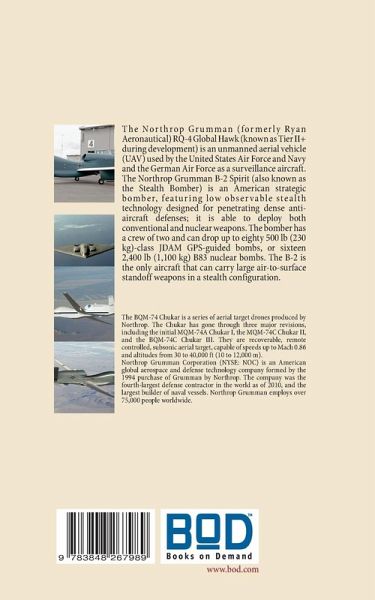 The Northrop Grumman (formerly Ryan Aeronautical) RQ-4 Global Hawk (known as Tier II+ during development) is an unmanned aerial vehicle (UAV) used by the United States Air Force and Navy and the German Air Force as a surveillance aircraft.The Northrop Grumman B-2 Spirit (also known as the Stealth Bomber) is an American strategic bomber, featuring low observable stealth technology designed for penetrating dense anti-aircraft defenses; it is able to deploy both conventional and nuclear weapons. The bomber has a crew of two and can drop up to eighty 500 lb (230 kg)-class JDAM GPS-guided bombs, or sixteen 2,400 lb (1,100 kg) B83 nuclear bombs. The B-2 is the only aircraft that can carry large air-to-surface standoff weapons in a stealth configuration.The BQM-74 Chukar is a series of aerial target drones produced by Northrop. The Chukar has gone through three major revisions, including the initial MQM-74A Chukar I, the MQM-74C Chukar II, and the BQM-74C Chukar III. They are recoverable, remote controlled, subsonic aerial target, capable of speeds up to Mach 0.86 and altitudes from 30 to 40,000 ft (10 to 12,000 m).Northrop Grumman Corporation (NYSE: NOC) is an American global aerospace and defense technology company formed by the 1994 purchase of Grumman by Northrop. The company was the fourth-largest defense contractor in the world as of 2010, and the largest builder of naval vessels. Northrop Grumman employs over 75,000 people worldwide. Its 2010 annual revenue is reported at US$34 billion. Northrop Grumman ranks #72 on the 2011 Fortune 500 list of America's largest corporations and ranks in the top ten military-friendly employers. It has its headquarters in Falls Church, Virginia.Separate sectors, such as Aerospace Systems, produce aircraft for the US and other nations. The B-2 Spirit strategic bomber, the E-8C Joint STARS surveillance aircraft, the RQ-4 Global Hawk, and the T-38 Talon supersonic trainer, are used by the US Air Force. The US Army uses Northrop Grumman's RQ-5 Hunter unmanned air vehicle, which have been in operational use for more than 10 years. The US Navy uses Northrop Grumman-built aerial vehicles such as the BQM-74 Chukar, RQ-4 Global Hawk based BAMS UAS, C-2 Greyhound, E-2 Hawkeye, and the EA-6B Prowler. Northrop Grumman provides major components and assemblies for different aircraft such as F/A-18 Hornet, F/A-18E/F Super Hornet and the EA-18G Growler.