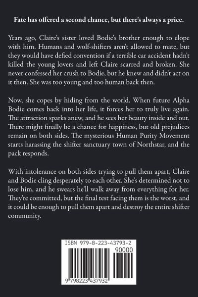 Fate has offered a second chance, but there's always a price. Years ago, Claire's sister loved Bodie's brother enough to elope with him. Humans and wolf-shifters aren't allowed to mate, but they would have defied convention if a terrible car accident hadn't killed the young lovers and left Claire scarred and broken. She never confessed her crush to Bodie, but he knew and didn't act on it then. She was too young and too human back then. Now, she copes by hiding from the world. When future Alpha Bodie comes back into her life, it forces her to truly live again. The attraction sparks anew, and he sees her beauty inside and out. There might finally be a chance for happiness, but old prejudices remain on both sides. The mysterious Human Purity Movement starts harassing the shifter sanctuary town of Northstar, and the pack responds. With intolerance on both sides trying to pull them apart, Claire and Bodie cling desperately to each other. She's determined not to lose him, and he swears he'll walk away from everything for her. They're committed, but the final test facing them is the worst, and it could be enough to pull them apart and destroy the entire shifter community. This is a nearly 65,000-word novel with intense, emotional themes and a more serious and in-depth plot.
