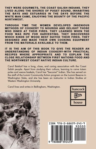 They were gourmets, the Coast Salish First Nations. They lived along the shores of the Puget Sound, inhabiting the bays and estuaries in the days before the white man came, enjoying the bounty of the Pacific Northwest. Through time, the women developed ingenious methods of cookery to nourish and delight those who dined at their fires. They learned when the food was ripe for harvesting. They discovered which kinds of wood best suited their fires. They designed and made their own cooking equipment from the materials available to them. It is the aim of this book to give the reader an understanding of Indian cookery- with practical recipes where appropriate- and to explain the close relationship between First Nation’s food and the Northwest Coast Salish culture.