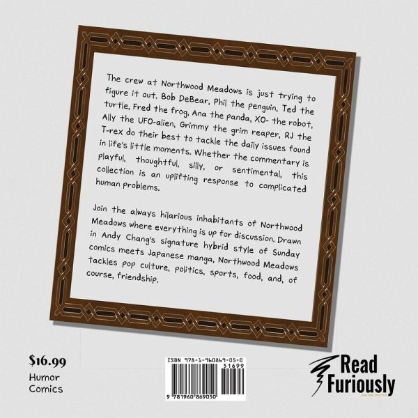 The crew at Northwood Meadows is just trying to figure it out. Bob DeBear, Phil the penguin, Ted the turtle, Fred the frog, Ana the panda, XO- the robot, Ally the UFO-alien, Grimmy the grim reaper, RJ the T-rex do their best to tackle the daily issues found in life's little moments. Whether the commentary is playful, thoughtful, silly, or sentimental, this collection is an uplifting response to complicated human problems. Join the always hilarious inhabitants of Northwood Meadows where everything is up for discussion. Drawn in Andy Chang's signature hybrid style of Sunday comics meets Japanese manga, Northwood Meadows tackles pop culture, politics, sports, food, and, of course, friendship.