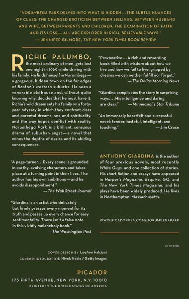 Richie Palumbo, the most ordinary of men, gets lost one night in 1969 while driving with his family. He finds himself in Norumbega-a gorgeous, hidden town on the far edges of Boston's western suburbs. He sees a venerable old house and, without quite knowing why, decides that he must have it. Richie's wild dream sets his family on a forty-year odyssey in which they confront class and parental dreams, sex and spirituality, and the way hopes conflict with reality. Anthony Giardina's Norumbega Park is a brilliant, sensuous drama of suburban angst-a novel that mines the depths of desire and its abiding consequences.