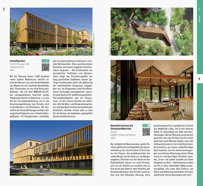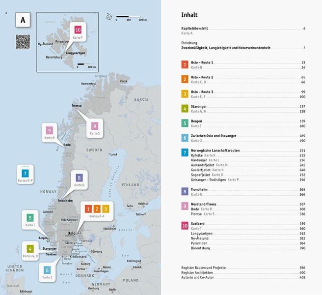 Der nördlichste Aquarienbau der Welt, eindrucksvoll gestaltete Aussichtspunkte inmitten spektakulärer Landschaften oder das Opernhaus in Oslo, das einen ganzen Stadtteil revitalisierte: Architektur besitzt in Norwegen immensen Stellenwert - und ist durch einen verantwortungsvollen Umgang mit der Natur und ihren Ressourcen gekennzeichnet. Dieser Architekturführer stellt 270 Objekte vor, insbesondere aus dem 20. und frühen 21. Jahrhundert. Sie finden sich nicht nur in den größten und meistbesuchten Städten - Oslo, Stavanger, Bergen und Trondheim -, sondern auch in den nördlichen Regionen: Bodø, Tromsø und Svalbard (Spitzbergen). Ein Sonderkapitel ist den Norwegischen Landschaftsrouten gewidmet, dem derzeit bedeutendsten Infrastrukturprojekt des Landes. Umweltschutz beim Bauen wird in Norwegen bereits konsequent umgesetzt - nicht nur durch den Einsatz innovativer Technologien, sondern auch durch die Gestaltung von Gebäuden und urbanen Räumen. Ob Fußgängerbrücke, Bürokomplex oder Wohnungsbau: Norwegische Architekten sind mit vielfältigen Herausforderungen konfrontiert, im Fokus ihrer Arbeit steht jedoch immer die Beziehung des Menschen zur Natur.