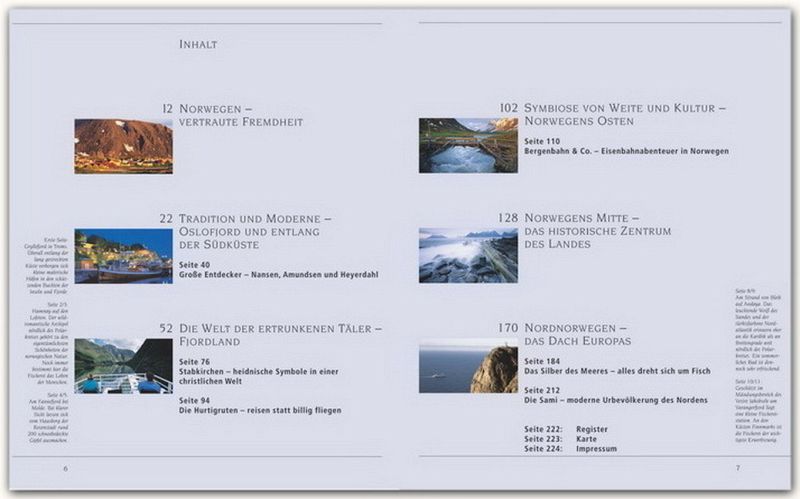 Vom Kap Lindesnes bis zum Nordkap zeigen über 330 Bilder alle Facetten dieses unvergleichlichen Landes. Sieben Specials berichten über die berühmten norwegischen Entdecker, die schönste Seereise der Welt auf der Hurtigroute, die Architektur der Stabkirchen, die Bevölkerungsgruppe der Samen, norwegische Künstler, den Fischfang und die Bergenbahn.