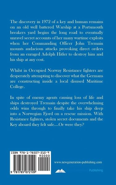 The discovery in 1972 of a key and human remains on an old well battered Warship at a Portsmouth breakers yard begins the long road to eventually unravel secret accounts of her many wartime exploits when her Commanding Officer John Tremain mounts audacious attacks provoking direct orders from an enraged Adolph Hitler to destroy him and his ship at any cost. Whilst in Occupied Norway Resistance fighters are desperately attempting to discover what the Germans are constructing inside a local disused Maritime College. In spite of enemy agents causing loss of life and ships destroyed Tremain despite the overwhelming odds wins through to finally take his ship deep into a Norwegian Fjord on a rescue mission. With Resistance fighters, stolen secret documents and the Key aboard they felt safe....Or were they?