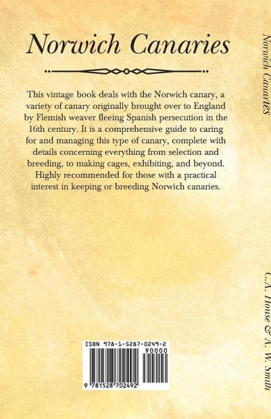 This vintage book deals with the Norwich canary, a variety of canary originally brought over to England by Flemish weaver fleeing Spanish persecution in the 16th century. It is a comprehensive guide to caring for and managing this type of canary, complete with details concerning everything from selection and breeding, to making cages, exhibiting, and beyond. Highly recommended for those with a practical interest in keeping or breeding Norwich canaries. Contents include: "Norwich Canaries", "The Breeding-Room and Cages", "Breeding Time", "The Moulting Season", "Exhibiting", "Forming a Stud", "Producing the Ideal", "A Fresh Start", "The Ideal Bird", "Yellows, Buffs and Cinnamons", "Colour and Size", "Training and Exhibition", "Eliminating Lumps", etc. Many vintage books such as this are increasingly scarce and expensive. It is with this in mind that we are republishing this volume now in an affordable, modern, high-quality edition complete with the original text and artwork.