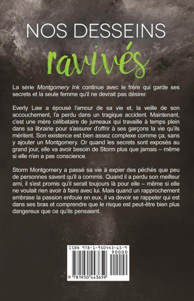 La série Montgomery Ink continue avec le frère qui garde ses secrets et la seule femme qu'il ne devrait pas désirer. Everly Law a épousé l'amour de sa vie et, la veille de son accouchement, l'a perdu dans un tragique accident. Maintenant, c'est une mère célibataire de jumeaux qui travaille à temps plein dans sa librairie pour s'assurer d'offrir à ses garçons la vie qu'ils méritent. Son existence est bien assez complexe comme ça, sans y ajouter un Montgomery. Or quand les secrets sont exposés au grand jour, elle va avoir besoin de Storm plus que jamais - même si elle n'en a pas conscience. Storm Montgomery a passé sa vie à expier des péchés que peu de personnes savent qu'il a commis. Quand il a perdu son meilleur ami, il s'est promis qu'il serait toujours là pour elle - même si elle ne voulait rien avoir à faire avec lui. Mais quand un rapprochement embrase la passion enfouie en eux, il va devoir se rappeler qui est dans ses bras et comprendre que le risque est peut-être bien plus dangereux que ce qu'ils pensaient.