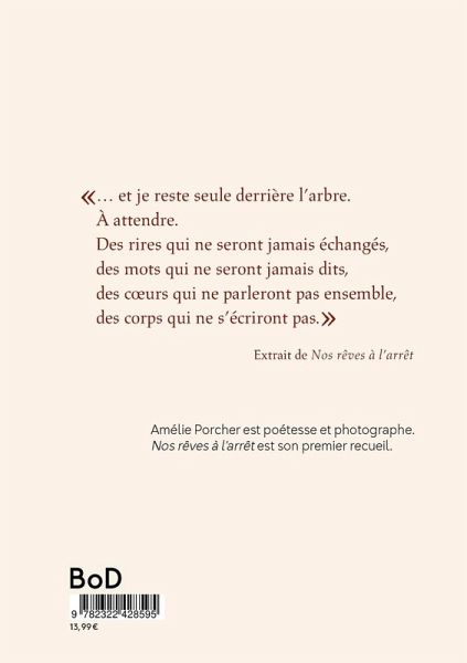 " Nos rêves à l'arrêt " est un recueil en six fragments abordant le thème du départ.Comme des polaroids, ces instantanés poétiques marquent un arrêt sur image :le rêve, l'amour, le deuil et l'exil s'y croisent l'espace d'un moment."...et je reste seule derrière l'arbre.À attendre.Des rires qui ne seront jamais échangés,des mots qui ne seront jamais dits,des coeurs qui ne parleront pas ensemble,des corps qui ne s'écriront pas."