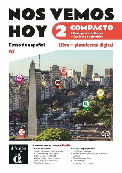 Esta edición consta de una copia impresa del libro del alumno y el cuaderno de ejercicios en un solo volumen, más un código de acceso de 12 meses a Campus Difusión, donde los alumnos podrán acceder a: - El libro de texto y cuaderno de ejercicios digital Nos vemos hoy 2. - Todos los recursos incluidos en el libro de texto (audio, vídeos, ejercicios de autocorrección, etc.). - Todas las funciones de comunicación, asignación de tareas y evaluación disponibles en la plataforma.