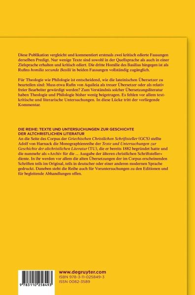 This publication provides the first comparison and commentary on two critical editions of the same sermon. Few texts have been preservedboth in the original language and in the language of the target audience. The third sermon of Basil is completely accessible in both versions as the homilia secunda Basilii of Rufinus.
